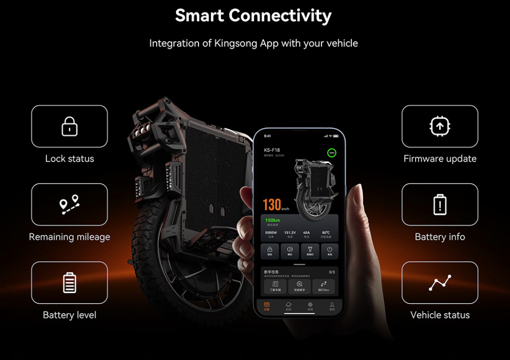 A KingSong F18 egy nagy teljesítményű elektromos egykerekű 5000 W-os (9000 W csúcsteljesítményű) motorral, akár 120 km/h maximális sebességgel, 2664 Wh-s akkumulátorral, 150 km hatótávval és 4 pontos, 100 mm rugóúttal rendelkező felfüggesztéssel. Ez egy csúcskategóriás modell a tapasztalt és igényes felhasználók számára.