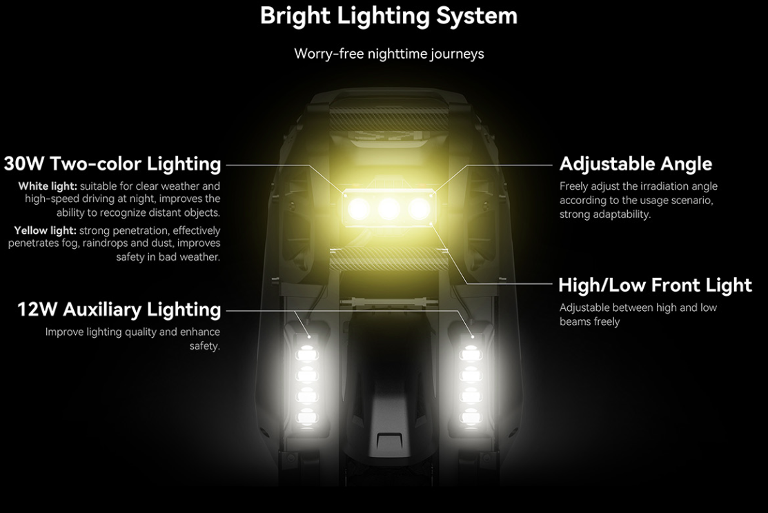 Akár 120 km/h sebességnél a biztonság elsődleges szempont – és a KingSong F18 ezt minden részletében tiszteletben tartja. Az erős motor (5000 W / 9000 W csúcs) fejlett elektronikával vezérelt, amely folyamatosan figyeli a stabilitást, a tapadást és a teljesítményt. A 4 × 5 W-os világítás kiváló láthatóságot és fényerőt biztosít, az állítható fényszög pedig jobb rálátást nyújt az útfelületre nagy sebességnél is. A széles 2.75-14 gumiabroncsok segítenek megőrizni a stabilitást nagy tempónál és élesebb kanyarokban, míg a 100 mm rugóútú felfüggesztés hatékonyan csillapítja az ütéseket, így az irányítás még egyenetlen felületen sem vész el. A magnéziumötvözetből készült váz növeli az egész szerkezet szilárdságát és tartósságát, míg a 140 kg teherbírás nagyobb terhelés mellett is biztonságos használatot tesz lehetővé. Az akár 45°-os emelkedők leküzdése is gond nélkül megoldható felesleges motorterhelés nélkül. Ezek az elemek együtt stabil és biztonságos vezetési élményt nyújtanak, ami különösen fontos a nagy teljesítmény és sebesség mellett.